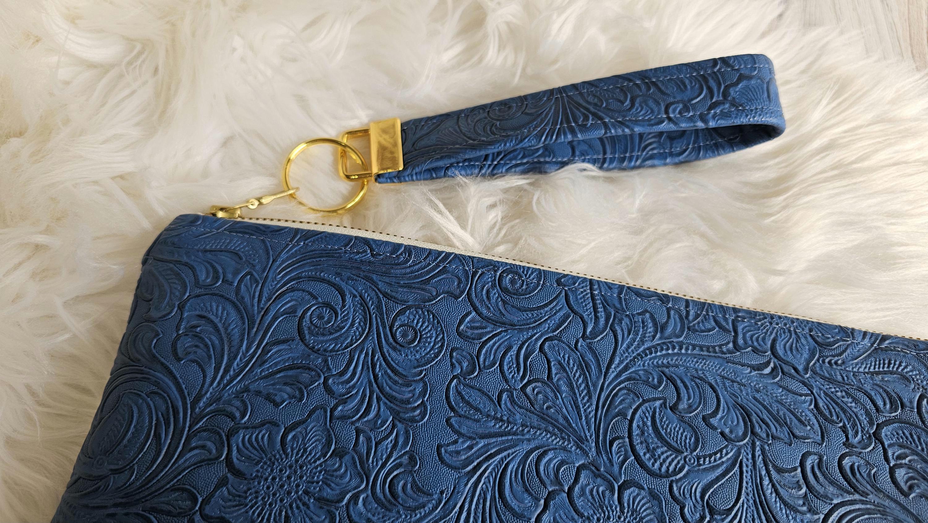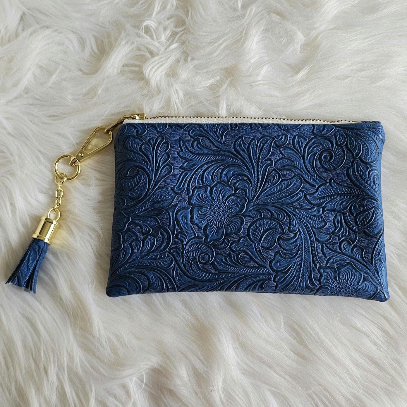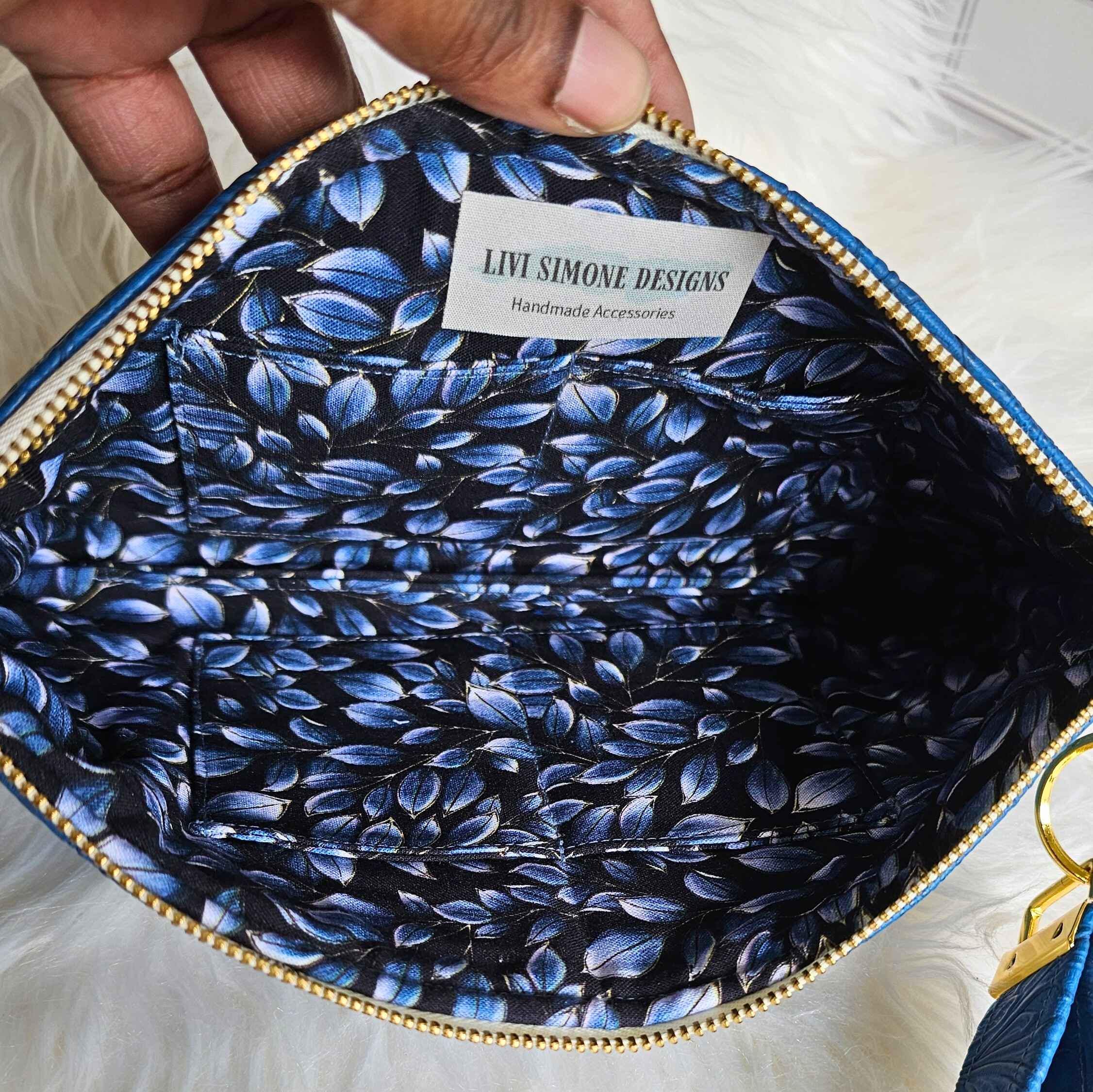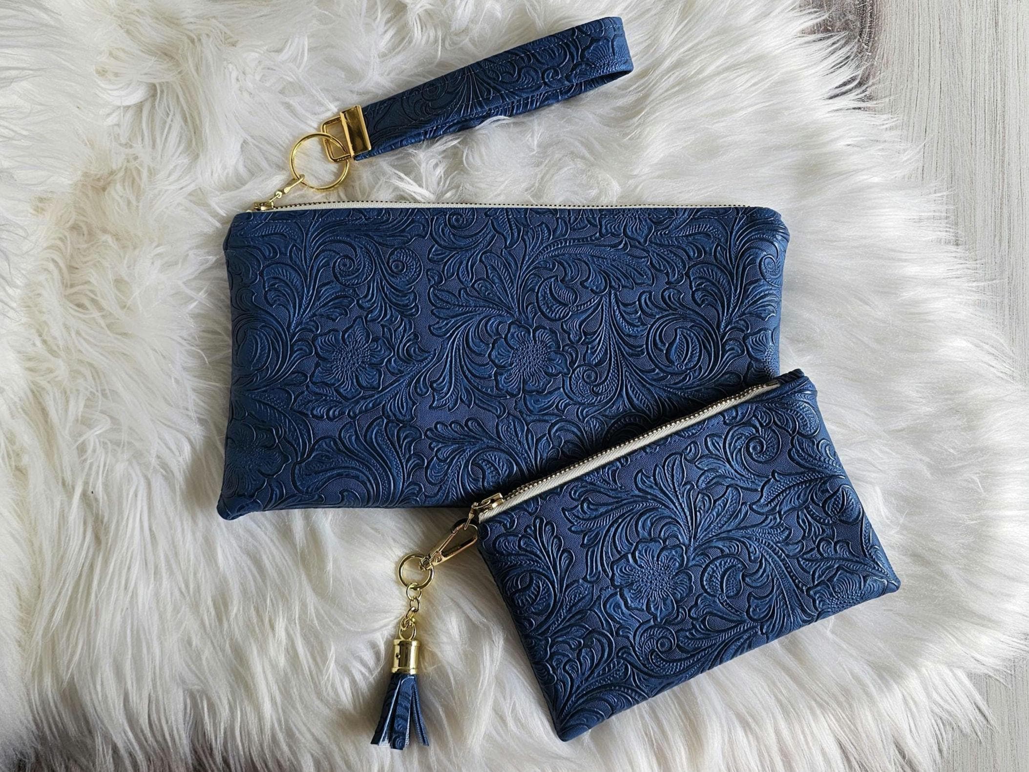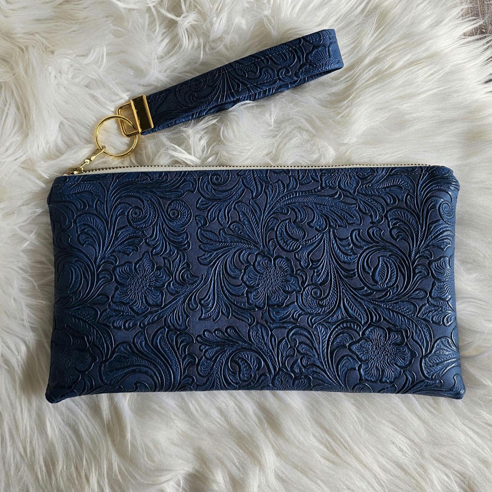 Navy Faux Leather Handmade Wristlet Clutch with four card slots and matching pouch