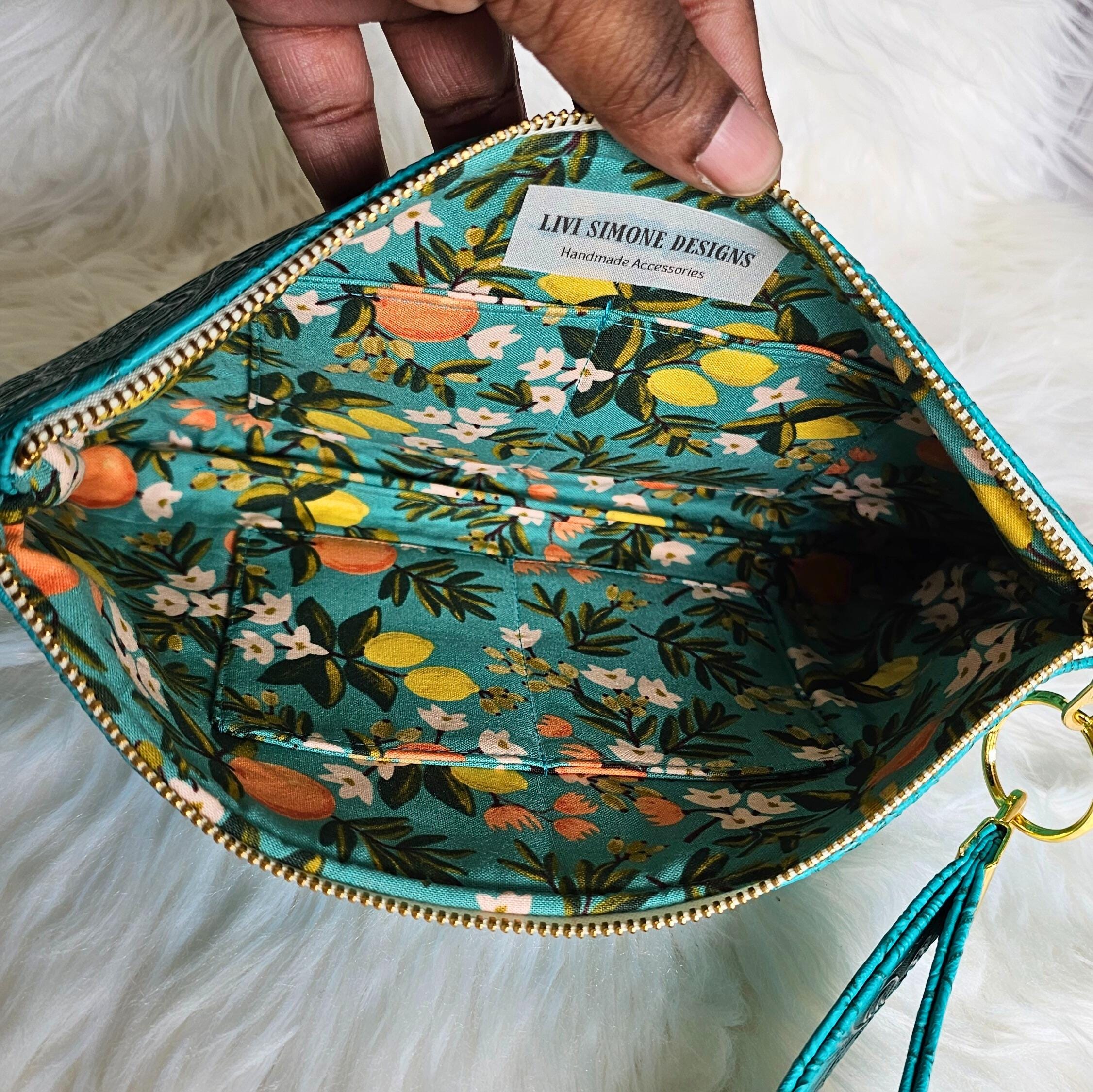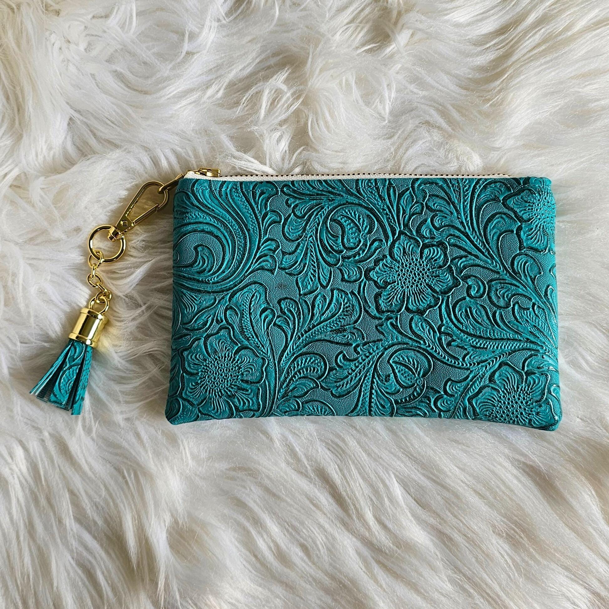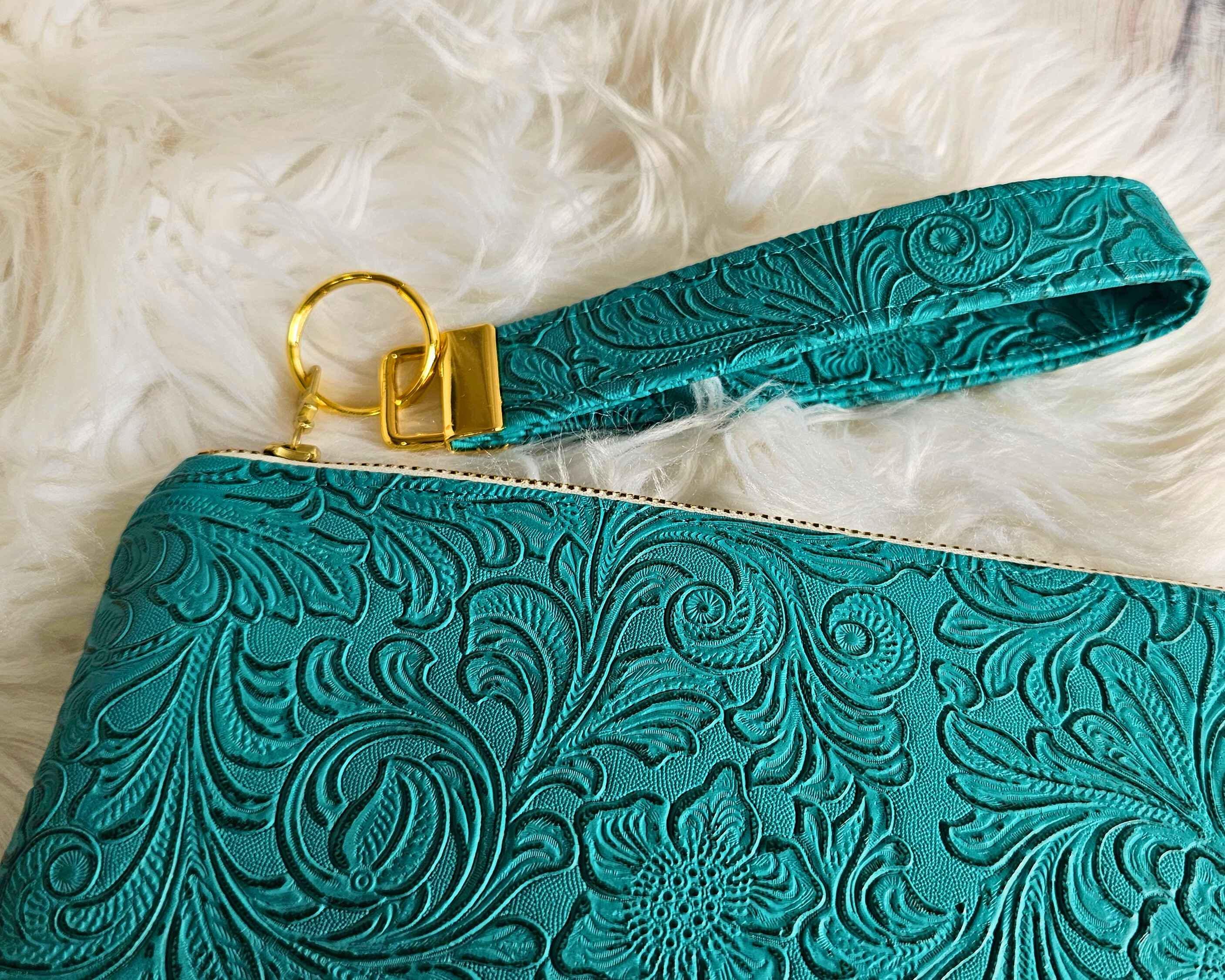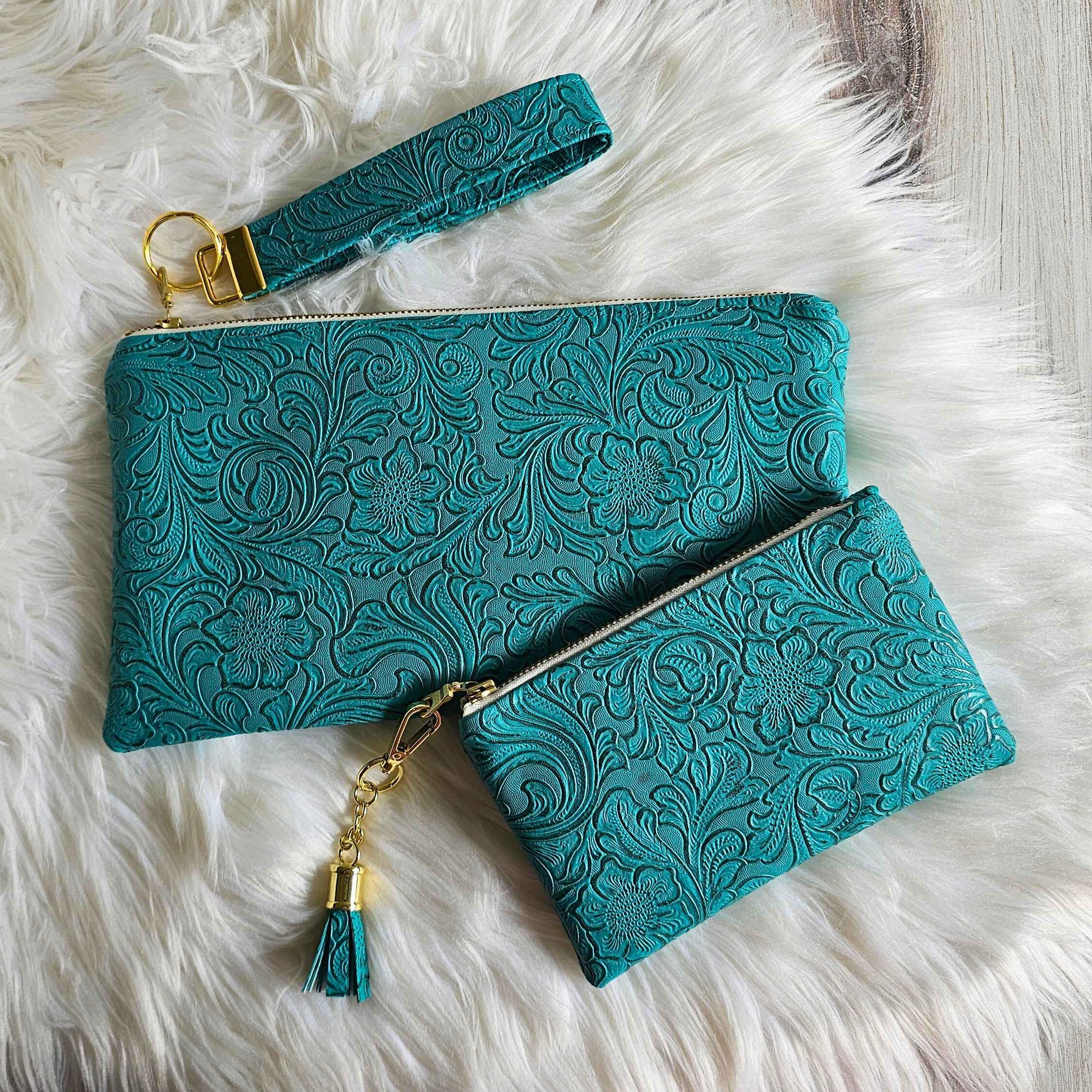 Teal Faux Leather Handmade Wristlet Clutch and Matching Pouch