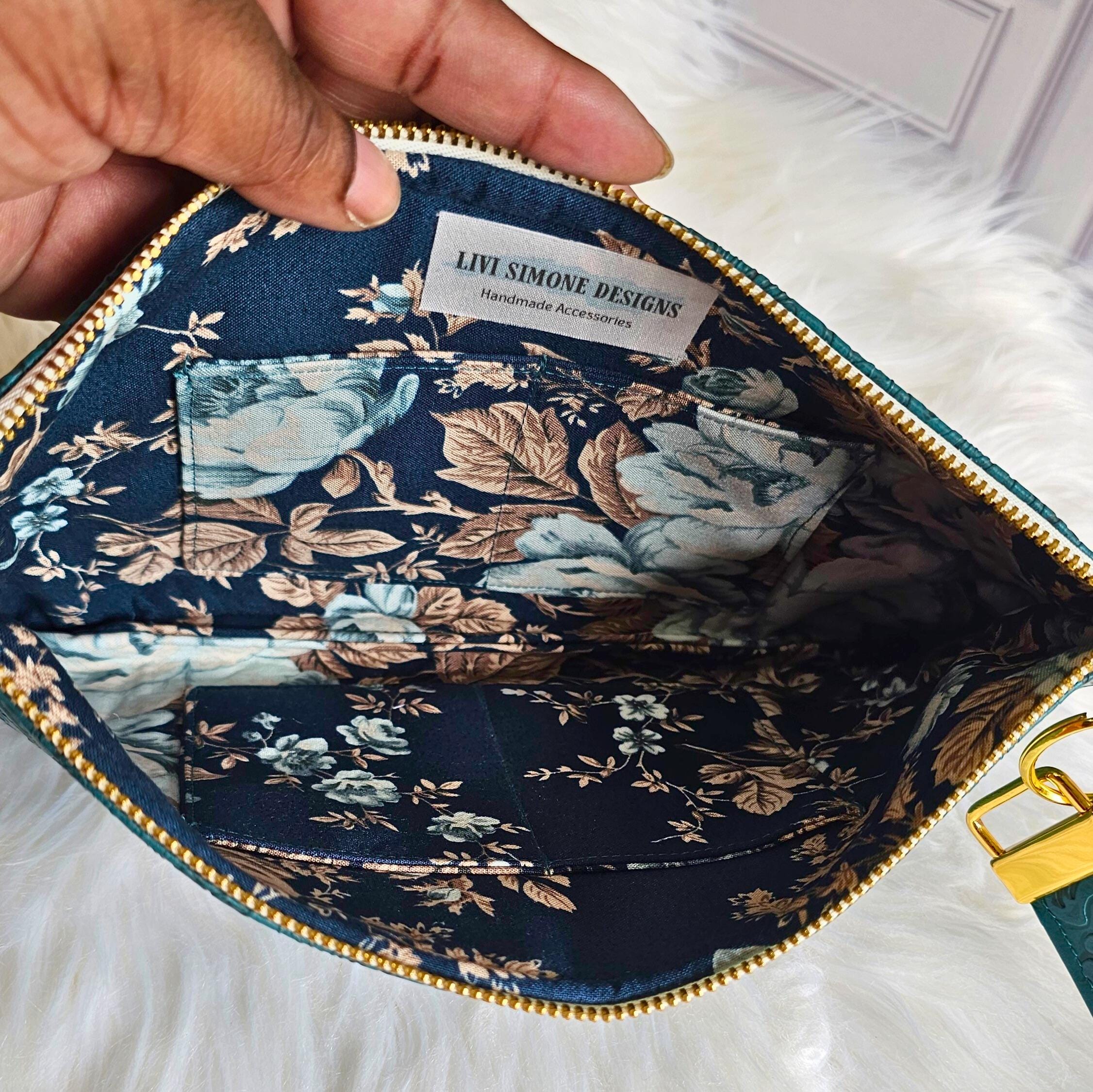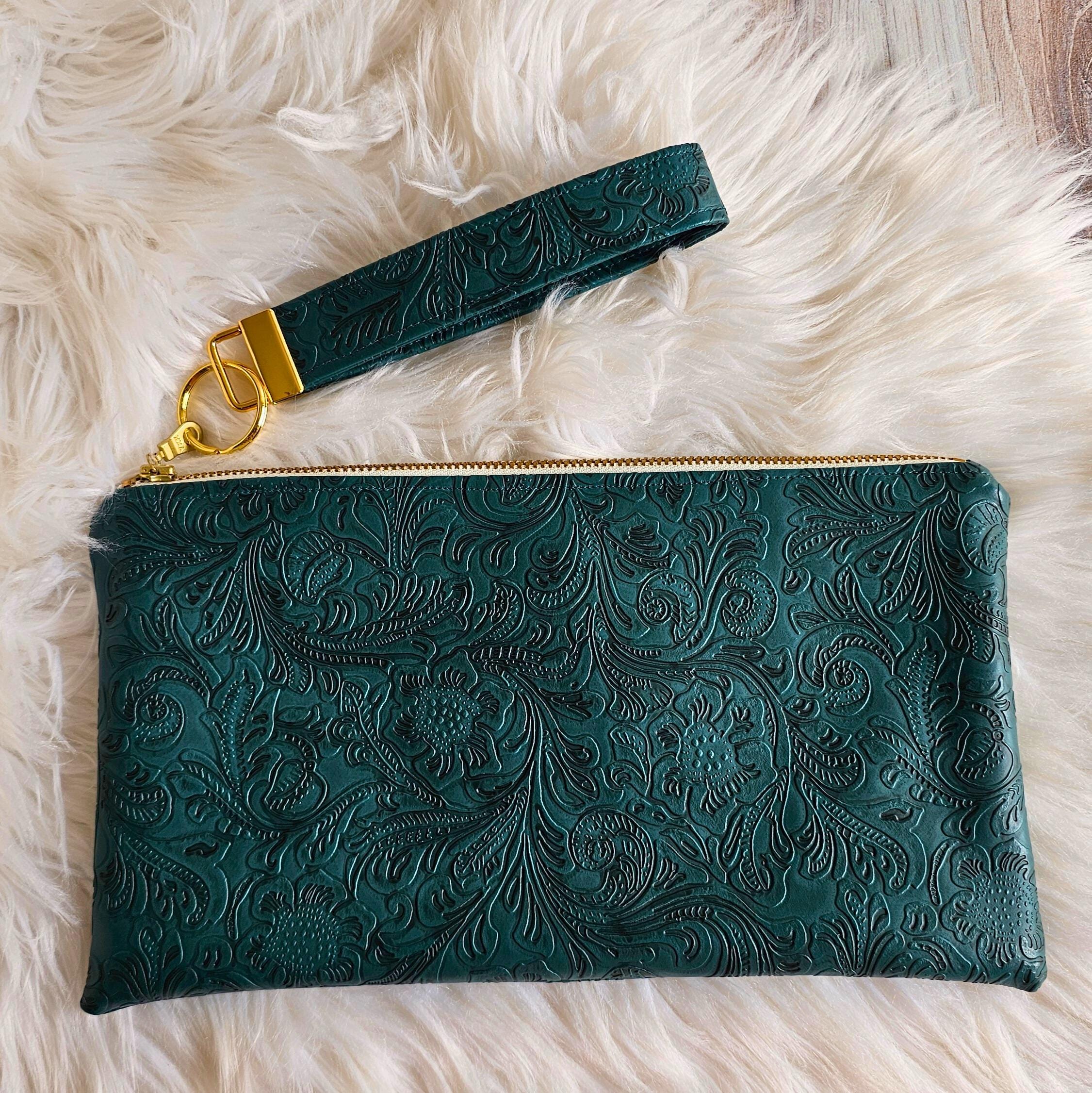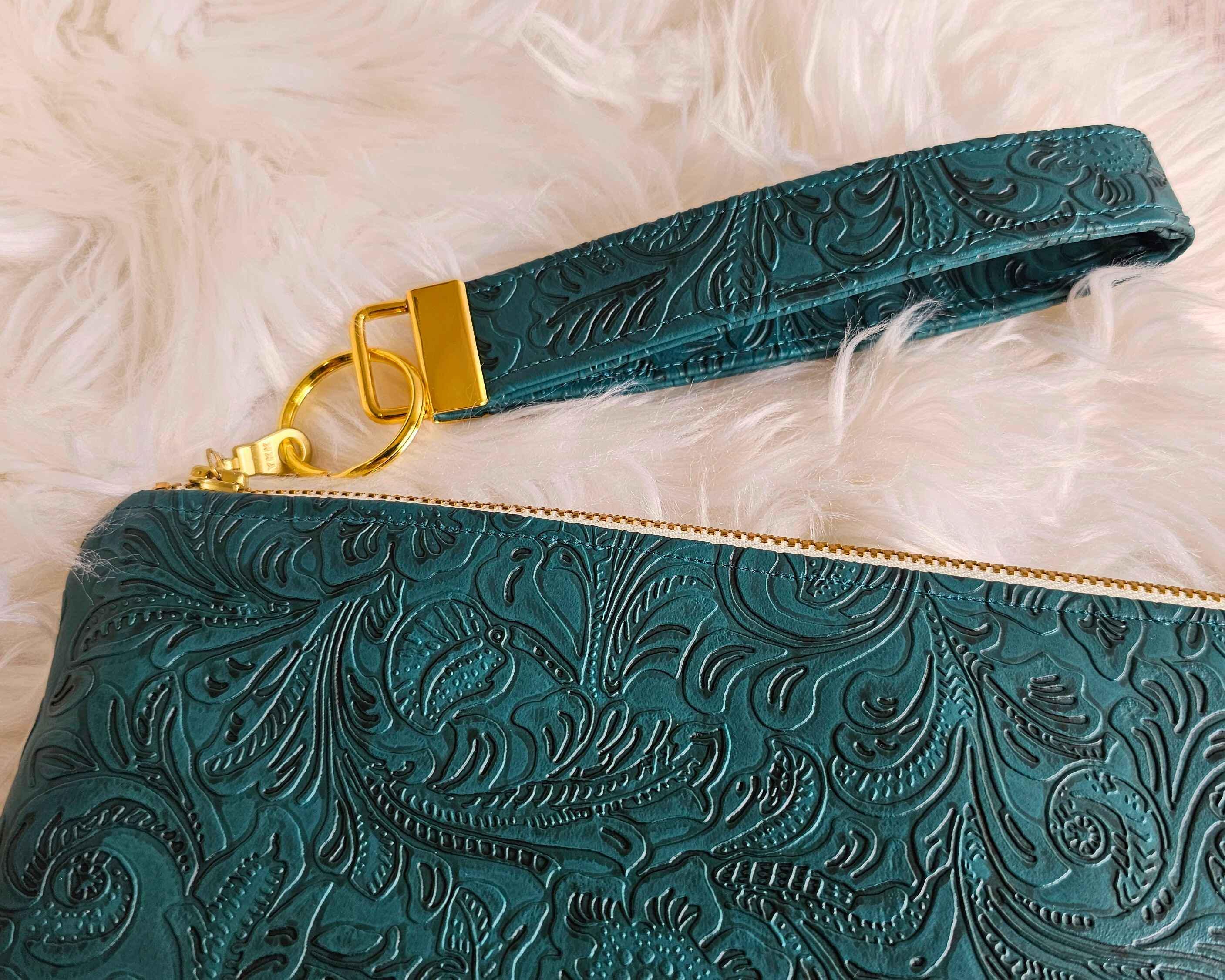 Sea Green Faux Leather Handmade Wristlet Clutch with four card slots and matching pouch